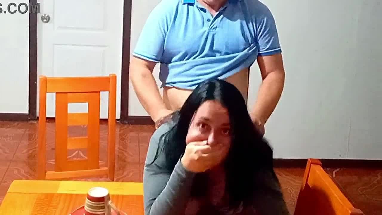 Stepsister slammed with a big dick in her tight asshole on the kitchen table after dinner.