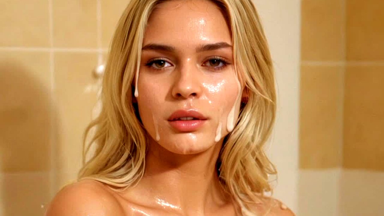 Slutty Bombshell Swallows Cum Shot on Face in Blowbang